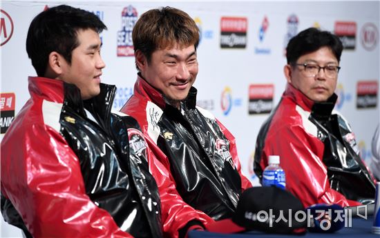 [아시아경제 김현민 기자]프로야구 2016 KBO 포스트시즌 플레이오프 미디어데이가 20일 마산종합운동장 올림픽기념관에서 열렸다. LG 이동현이 미소 짓고 있다.