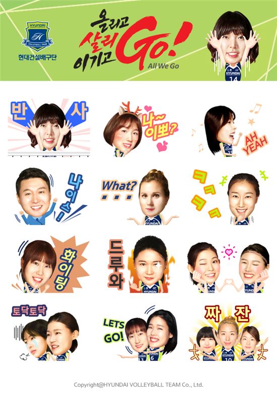 이밖에 한유미, 김연견, 에밀리 하통 등 다양한 선수들이 이모티콘에 등장한다. 이모티콘은 선수 개별 특징을 살려 총 열두 개를 제작했다. 카카오톡 '플러스친구' 채널을 통해 '현대건설배구단'을 검색하고 친구를 맺으면 무료로 내려받을 수 있다. 다운로드한 시점부터 30일 동안 이용할 수 있고, 11월 17일 오전 11시까지 내려받기가 가능하다.