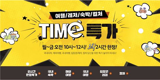 투어타임특가 기획전은 월요일부터 금요일까지 매일 오전 10시부터 2시간 동안 진행된다. 숙박, 입장권, 국내여행, 항공권, 해외여행, 문화 등 위메프에서 판매하는 상품들 중 3~6개의 특가 상품을 선보인다.