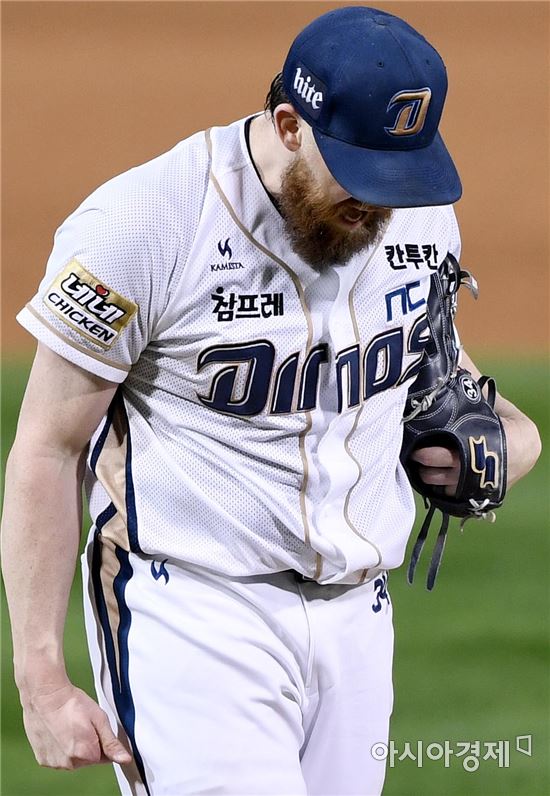 [아시아경제 김현민 기자]프로야구 LG와 NC의 2016 KBO 포스트시즌 플레이오프 1차전이 21일 마산구장에서 열렸다. NC 선발투수 해커가 4회초 2사 2루에서 LG 오지환을 삼진으로 처리하며 이닝을 마친 뒤 고함을 지르고 있다.