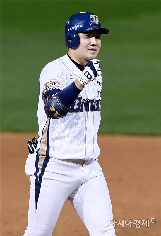 [아시아경제 김현민 기자]프로야구 LG와 NC의 2016 KBO 포스트시즌 플레이오프 1차전이 21일 마산구장에서 열렸다. 4회말 무사 1루에서 NC 박민우가 우전 안타를 치고 환호하고 있다.
