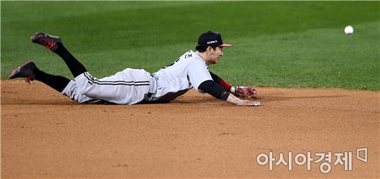 [아시아경제 김현민 기자]프로야구 LG와 NC의 2016 KBO 포스트시즌 플레이오프 1차전이 21일 마산구장에서 열렸다. 4회초 무사 1루에서 LG 2루수 손주인이 NC 박민우의 우전 안타 타구를 쫓아 몸을 날리고 있다.