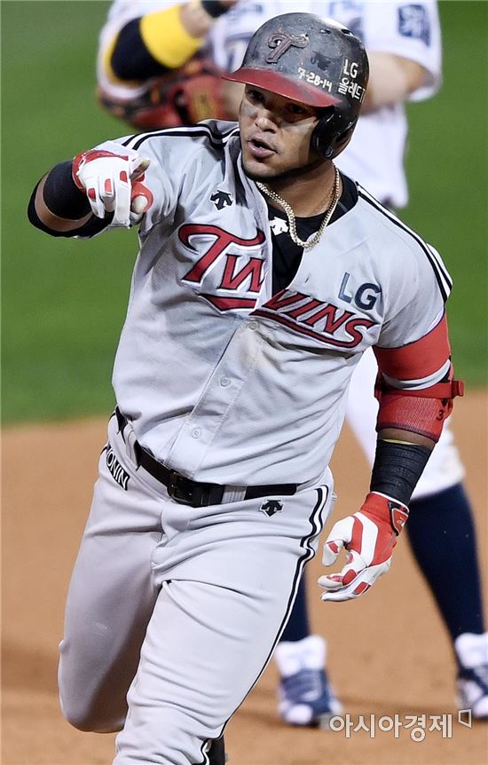 [아시아경제 김현민 기자]프로야구 LG와 NC의 2016 KBO 포스트시즌 플레이오프 1차전이 21일 마산구장에서 열렸다. 7회초 LG 선두타자 히메네스가 NC 선발 해커를 상대로 좌월 선제 솔로 홈런을 치고 환호하고 있다.
