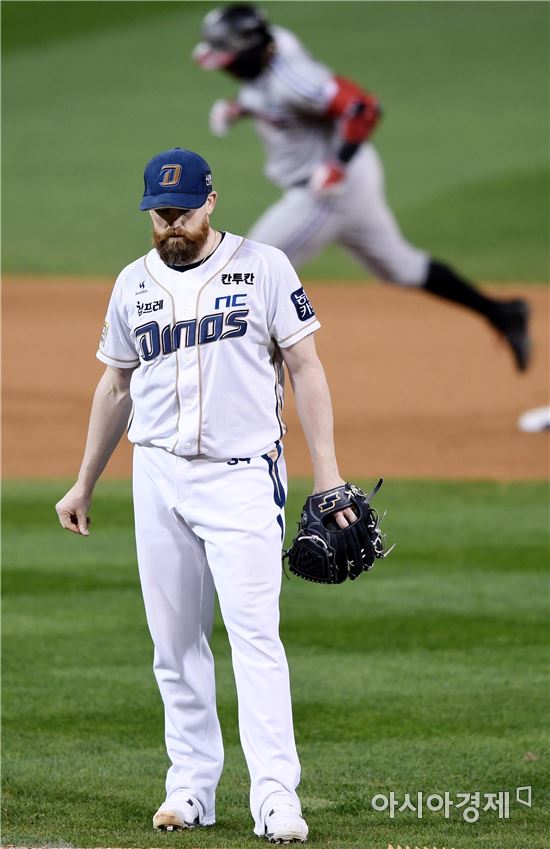 [아시아경제 김현민 기자]프로야구 LG와 NC의 2016 KBO 포스트시즌 플레이오프 1차전이 21일 마산구장에서 열렸다. NC 선발투수 해커가 7회초 LG 선두타자 히메네스에게 선제 솔로 홈런을 허용하고 있다.