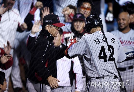 [아시아경제 김현민 기자]프로야구 LG와 NC의 2016 KBO 포스트시즌 플레이오프 1차전이 21일 마산구장에서 열렸다. 8회초 LG 선두타자 정상호가 NC 선발 해커를 상대로 추가 좌월 솔로 홈런을 치고 양상문 감독과 하이파이브하고 있다.