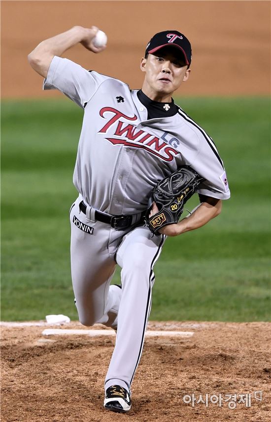[아시아경제 김현민 기자]프로야구 LG와 NC의 2016 KBO 포스트시즌 플레이오프 1차전이 21일 마산구장에서 열렸다. 9회말 LG 마무리 임정우가 역투하고 있다.
