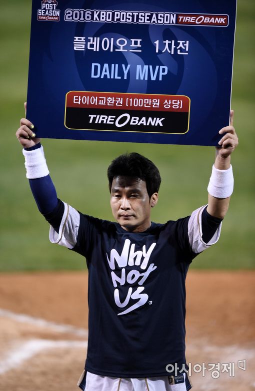 [아시아경제 김현민 기자]프로야구 LG와 NC의 2016 KBO 포스트시즌 플레이오프 1차전이 21일 마산구장에서 열렸다. 9회말 끝내기 안타로 팀의 3-2 역전승을 이끈 NC 용덕한이 데일리 MVP에 선정되고 있다.