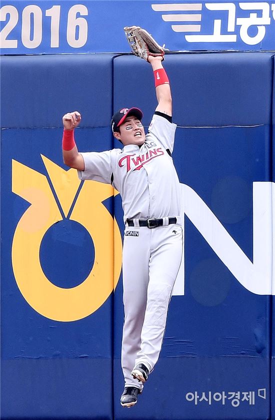 [창원=아시아경제 김현민 기자]프로야구 LG와 NC의 2016 KBO 포스트시즌 플레이오프 2차전이 22일 마산구장에서 열렸다. 4회말 2사에서 LG 우익수 채은성이 NC 이호준의 타구를 잡아내고 있다.