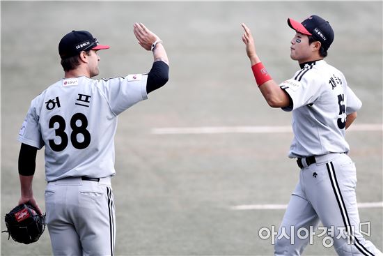 [창원=아시아경제 김현민 기자]프로야구 LG와 NC의 2016 KBO 포스트시즌 플레이오프 2차전이 22일 마산구장에서 열렸다. LG 선발 허프가 4회말 2사에서 NC 이호준의 타구를 호수비로 잡아낸 우익수 채은성과 하이파이브하고 있다.