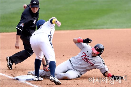 [창원=아시아경제 김현민 기자]프로야구 LG와 NC의 2016 KBO 포스트시즌 플레이오프 2차전이 22일 마산구장에서 열렸다. 5회초 1사에서 LG 채은성이 우중간 3루타를 치고 출루하고 있다.