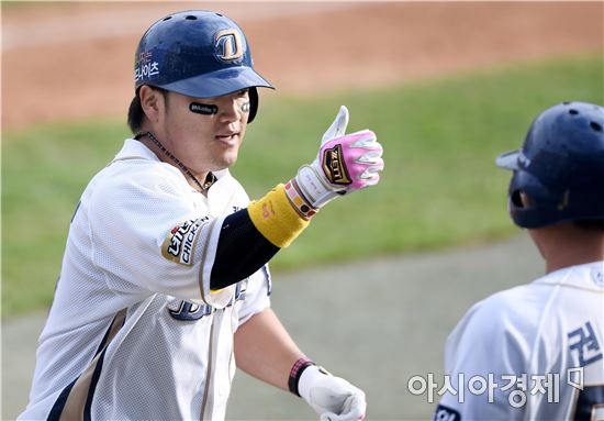 [창원=아시아경제 김현민 기자]프로야구 LG와 NC의 2016 KBO 포스트시즌 플레이오프 2차전이 22일 마산구장에서 열렸다. 7회말 2사에서 NC 박석민이 LG 선발 허프를 상대로 선제 투런 홈런을 치고 환호하고 있다.