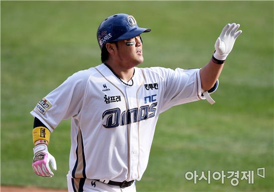 [창원=아시아경제 김현민 기자]프로야구 LG와 NC의 2016 KBO 포스트시즌 플레이오프 2차전이 22일 마산구장에서 열렸다. 7회말 2사에서 NC 박석민이 LG 선발 허프를 상대로 선제 투런 홈런을 치고 환호하고 있다.