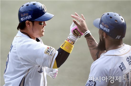 [창원=아시아경제 김현민 기자]프로야구 LG와 NC의 2016 KBO 포스트시즌 플레이오프 2차전이 22일 마산구장에서 열렸다. 7회말 2사에서 NC 박석민이 LG 선발 허프를 상대로 선제 투런 홈런을 치고 선행주자 테임즈와 하이파이브하고 있다.