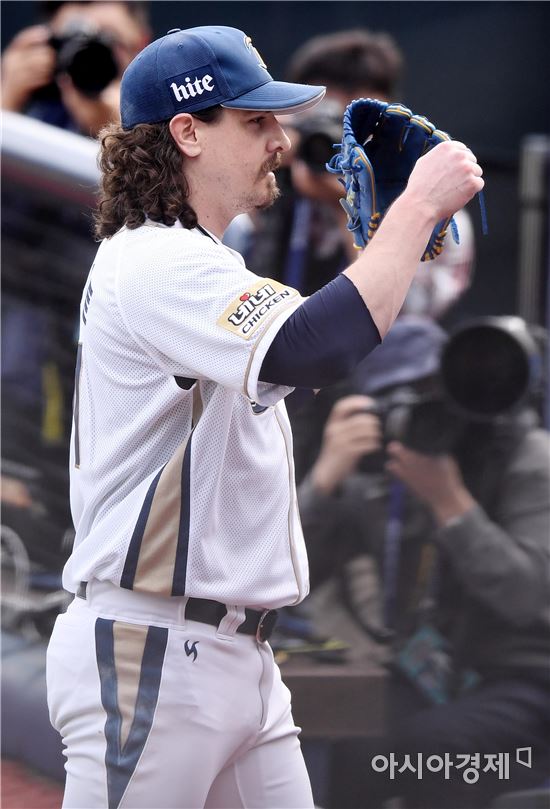 [창원=아시아경제 김현민 기자]프로야구 LG와 NC의 2016 KBO 포스트시즌 플레이오프 2차전이 22일 마산구장에서 열렸다. NC 선발 스튜어트가 8회초 1사에서 원종현과 교체돼 마운드를 내려오고 있다.