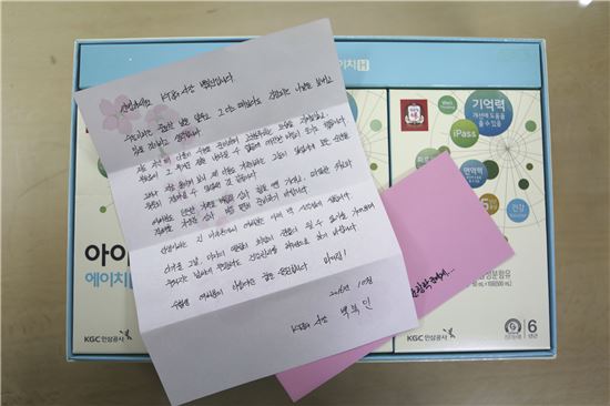 KT&G는 그동안의 갈고 닦은 실력을 충분히 발휘하길 기원하는 백복인 사장의 격려편지와 함께 수험생활 막바지 지친 체력 회복 등을 위해 ‘정관장 아이패스’ 제품을 수험생 235명에게 전달했다.