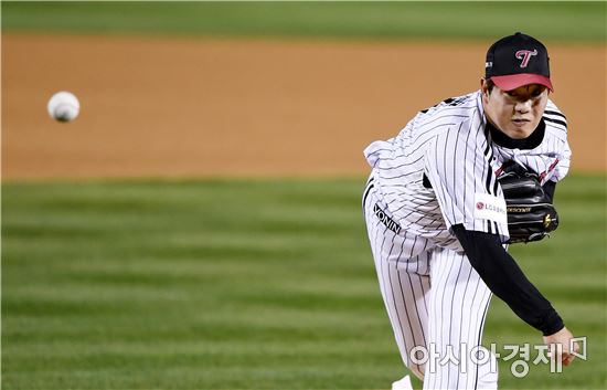 [아시아경제 김현민 기자]프로야구 NC와 LG의 2016 KBO 포스트시즌 플레이오프 3차전이 24일 잠실구장에서 열렸다. LG 선발투수 류제국이 역투하고 있다.