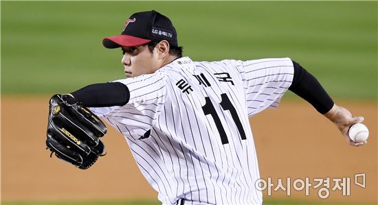 [아시아경제 김현민 기자]프로야구 NC와 LG의 2016 KBO 포스트시즌 플레이오프 3차전이 24일 잠실구장에서 열렸다. LG 선발투수 류제국이 역투하고 있다.