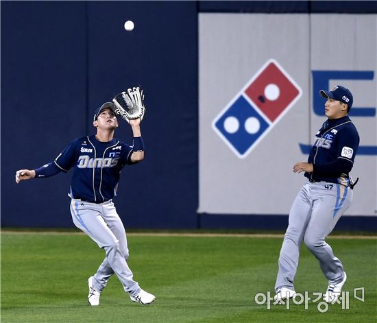 [아시아경제 김현민 기자]프로야구 NC와 LG의 2016 KBO 포스트시즌 플레이오프 3차전이 24일 잠실구장에서 열렸다. 2회말 무사 1루에서 NC 중견수 김준완이 LG 김용의의 뜬공을 잡아내고 있다.
