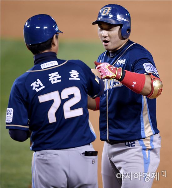 [아시아경제 김현민 기자]프로야구 NC와 LG의 2016 KBO 포스트시즌 플레이오프 3차전이 24일 잠실구장에서 열렸다. 3회초 NC 선두타자 김태군이 우전 안타를 치고 출루한 뒤 전준호 코치와 하이파이브하고 있다.