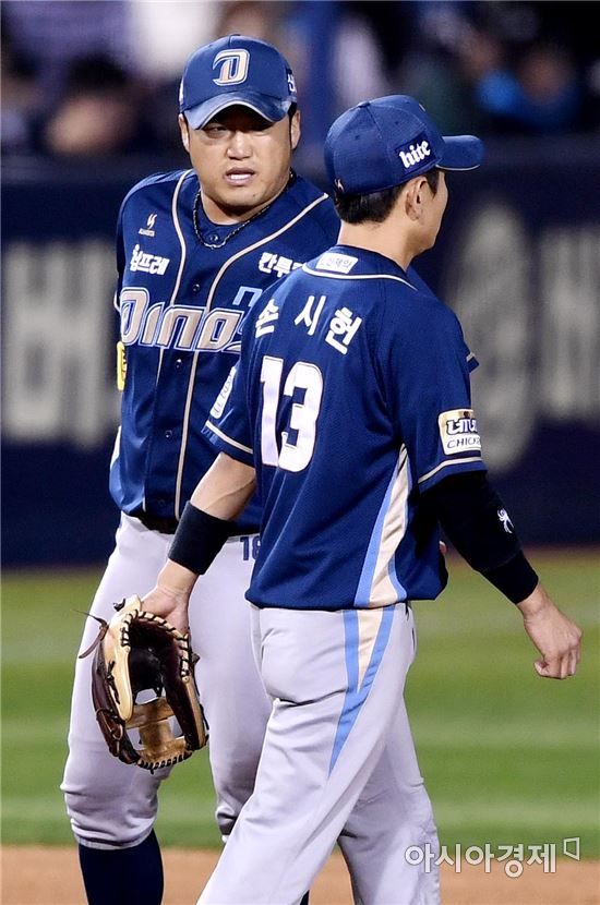 [아시아경제 김현민 기자]프로야구 NC와 LG의 2016 KBO 포스트시즌 플레이오프 3차전이 24일 잠실구장에서 열렸다. 3회말 2사 1루에서 LG 정상호의 유격수 땅볼 때 실책성 플레이로 내야 안타를 내준 NC 유격수 손시헌이 박석민과 이야기하고 있다.