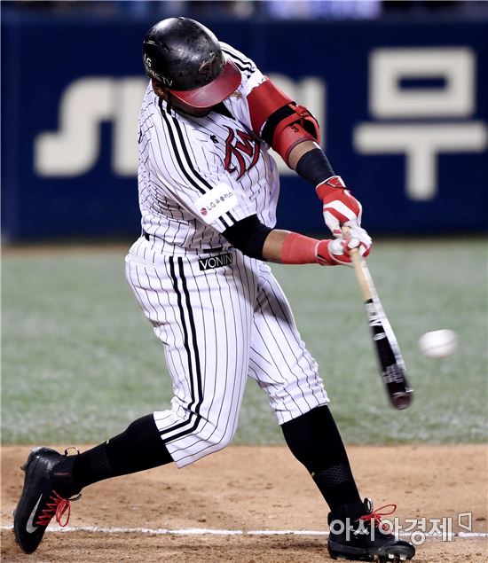 [아시아경제 김현민 기자]프로야구 NC와 LG의 2016 KBO 포스트시즌 플레이오프 3차전이 24일 잠실구장에서 열렸다. 4회말 2사 1루에서 LG 히메네스가 좌전 안타를 치고 있다.