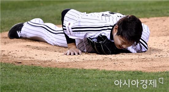 [아시아경제 김현민 기자]프로야구 NC와 LG의 2016 KBO 포스트시즌 플레이오프 3차전이 24일 잠실구장에서 열렸다. LG 선발 류제국이 5회초 1사 1루에서 NC 김태군의 투수 강습 타구를 피하다 넘어지고 있다.