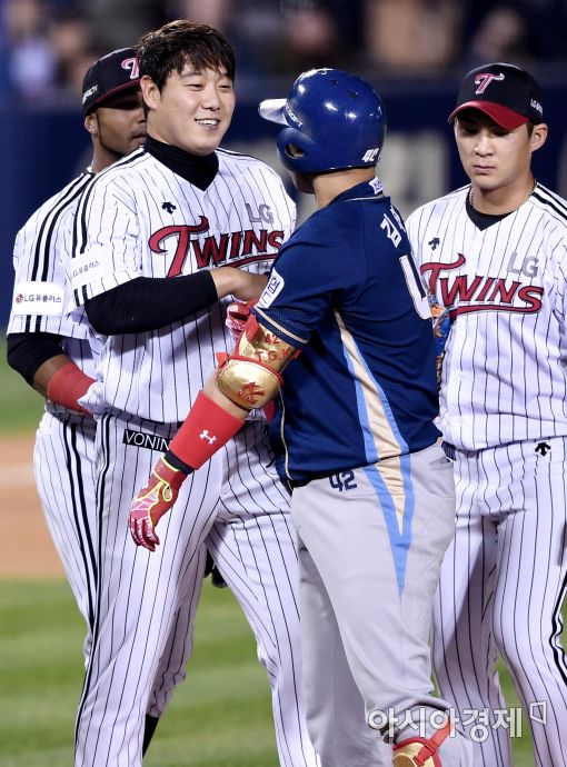 [아시아경제 김현민 기자]프로야구 NC와 LG의 2016 KBO 포스트시즌 플레이오프 3차전이 24일 잠실구장에서 열렸다. LG 선발 투수 류제국이 5회초 1사 1루에서 투수 강습 타구를 친 NC 김태군에게 괜찮다는 손짓을 하고 있다.