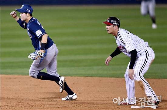 [아시아경제 김현민 기자]프로야구 NC와 LG의 2016 KBO 포스트시즌 플레이오프 3차전이 24일 잠실구장에서 열렸다. 6회말 2사 만루에서 NC 2루수 박민우가 LG 채은성의 유격수 땅볼 떄 1루주자 오지환을 포스아웃 시킨 뒤 주먹을 쥐며 기뻐하고 있다.