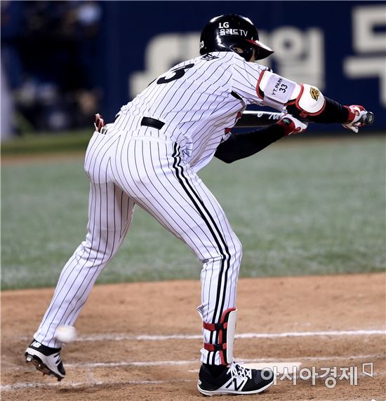 [아시아경제 김현민 기자]프로야구 NC와 LG의 2016 KBO 포스트시즌 플레이오프 3차전이 24일 잠실구장에서 열렸다. 8회말 무사 1,2루에서 LG 박용택이 왼쪽 발목에 사구를 맞고 있다.