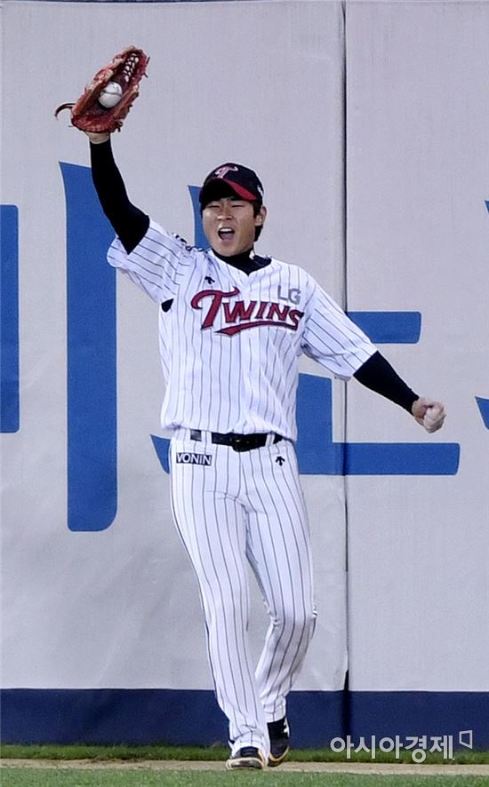 [아시아경제 김현민 기자]프로야구 NC와 LG의 2016 KBO 포스트시즌 플레이오프 3차전이 24일 잠실구장에서 열렸다. 연장 11회초 2사 1,2루에서 LG 중견수 안익훈이 NC 나성범의 타구를 잡아낸 뒤 환호하고 있다.