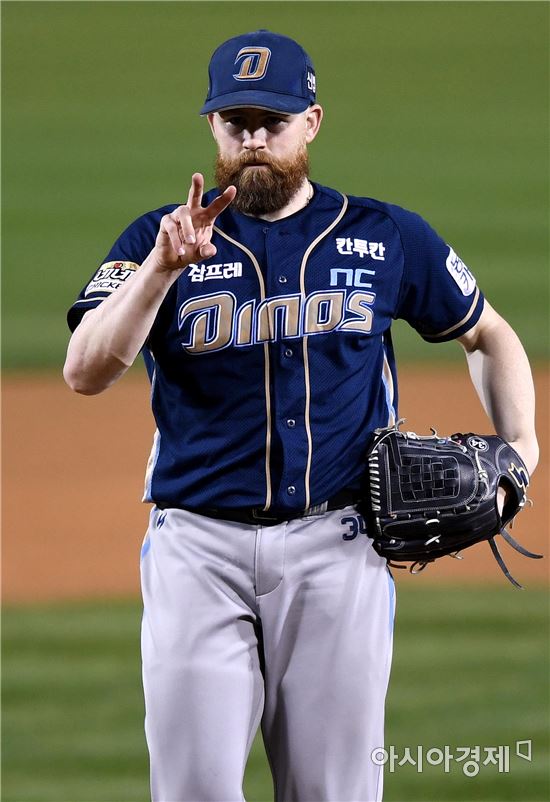 [아시아경제 김현민 기자]프로야구 NC와 LG의 2016 KBO 포스트시즌 플레이오프 4차전이 25일 잠실구장에서 열렸다. NC 선발투수 해커가 김태군 포수를 향해 손짓하고 있다.