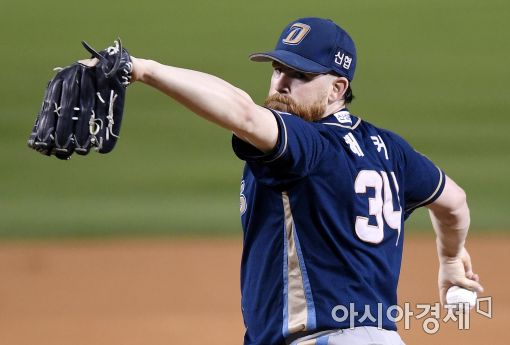 [아시아경제 김현민 기자]프로야구 NC와 LG의 2016 KBO 포스트시즌 플레이오프 4차전이 25일 잠실구장에서 열렸다. NC 선발투수 해커가 역투하고 있다.