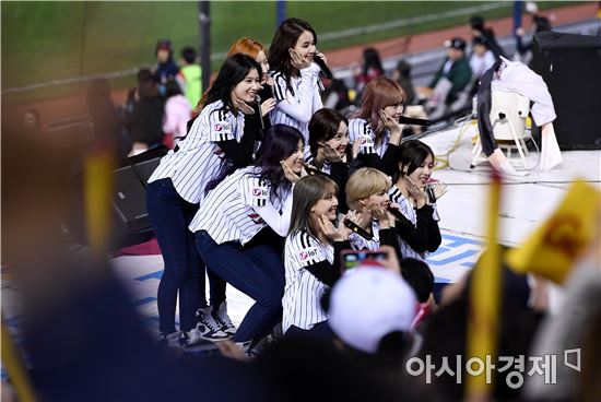 [아시아경제 김현민 기자]프로야구 NC와 LG의 2016 KBO 포스트시즌 플레이오프 4차전이 25일 잠실구장에서 열렸다. 5회말 종료 후 걸그룹 트와이스 1루 응원단상에 올라 공연하고 있다.