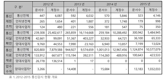 보고서에 따르면 2012년부터 2015년까지 통신 제한 조치(감청:통신 내용을 확인)는 연평균 483건, 5523개 계정에 대해 이루어졌다.