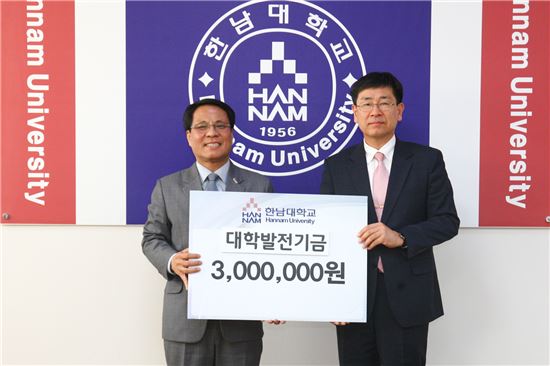 [아시아경제(대전) 정일웅 기자] 한남대는 올해 개교 60주년을 맞이해 진행하고 있는 학교발전기금 모금 운동에 학부모 참여가 이어지고 있다고 3일 밝혔다. 대학에 따르면 자녀가 한남대 영문과에 재학 중인 정완영 학부모는 2일 대학을 방문, 300만원의 발전기금을 기탁했다. 앞서 철학상담학과 재학생의 학부모 이경은 씨도 지난달 대학에 학교발전 기금 300만원을 흔쾌히 기탁했다. 이처럼 교내 재학생들의 학부모가 학교발전 기금 운동에 동참하는 것에 대해 대학은 어려운 경제여건 속에서 도움의 손길을 준 것에 대해 감사를 표하며 올바른 학생교육에 매진할 것을 약속했다. 이덕훈 총장(왼쪽)과 정완영 학부모(오른쪽)가 기념사진을 찍고 있다. 한남대 제공