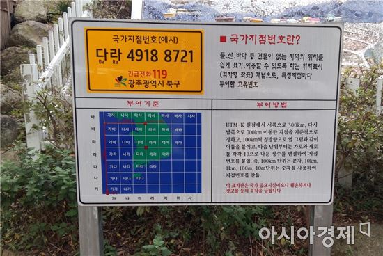 국가지점번호판은 도로명 주소가 부여되지 않는 산·들판 등에 설치해 기관마다 서로 다른 위치표시체계를 통일, 조난자의 정확한 위치를 파악하는 시스템으로 한글 2자리와 숫자 8자리로 구성됐다.