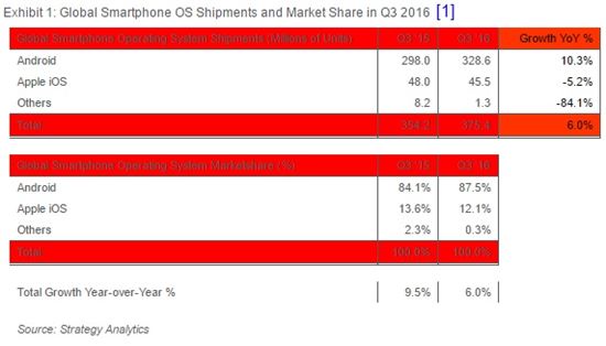 3일(현지시간) 시장조사업체 스트래티지 애널리틱스는 2016년도 3분기 구글 안드로이드가 시장 점유율 87.5%를 차지했다고 밝혔다. 전년 동기 대비 점유율이 3.4%포인트 올랐다. 판매량도 2억9800만대에서 3억2860만대로 같은 기간 10.3% 증가했다.