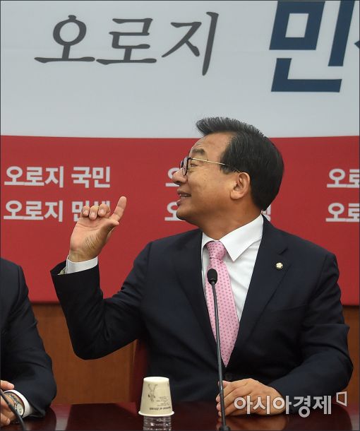 [아시아경제 윤동주 기자] 이정현 새누리당 대표가 7일 서울 여의도 당사에서 열린 최고위원회의에서 회의 도중 당직자에게 손짓으로 신호를 보내고 있다.