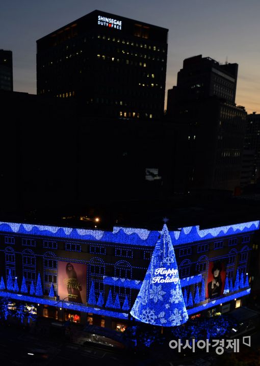 [아시아경제 문호남 인턴기자] 9일 서울 중구 신세계백화점 본점에서 크리스마스를 맞아 설치된 20m 높이의 대형트리가 빛을 밝히고 있다.