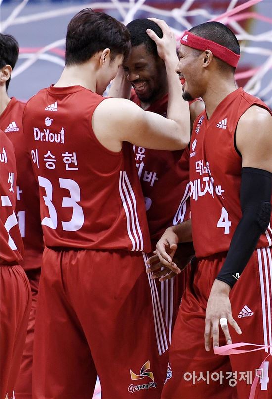 [고양=아시아경제 김현민 기자]프로농구 고양 오리온과 창원 LG의 2016-2017 정규리그 경기가 9일 고양체육관에서 열렸다. 오리온 헤인즈가 팀의 84-83 승리를 확정한 뒤 동료들과 기뻐하고 있다.