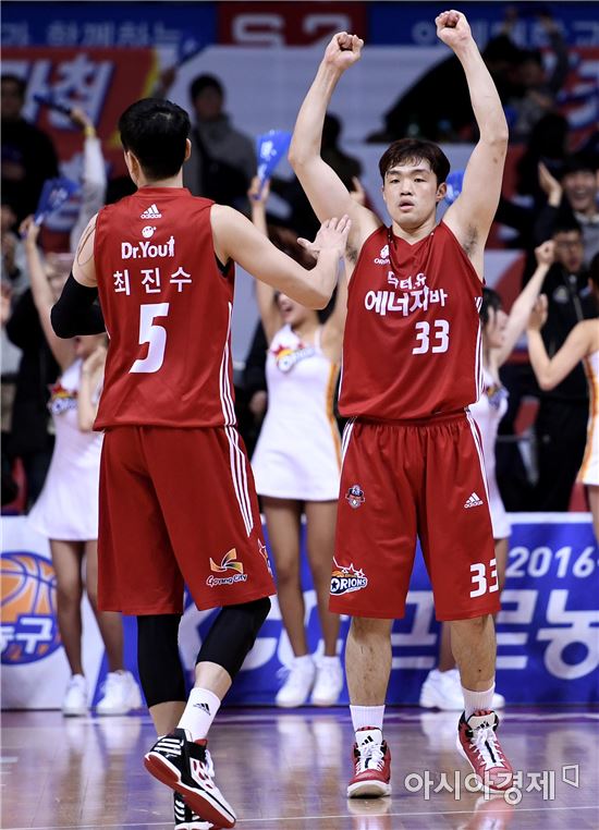 [고양=아시아경제 김현민 기자]프로농구 고양 오리온과 창원 LG의 2016-2017 정규리그 경기가 9일 고양체육관에서 열렸다. 오리온 이승현이 팀의 84-83 승리를 확정한 뒤 동료들과 기뻐하고 있다.