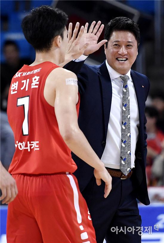 [아시아경제 김현민 기자]프로농구 서울 SK와 부산 kt의 2016-2017 정규리그 경기가 13일 서울 잠실학생체육관에서 열렸다. SK 문경은 감독이 3점슛을 성공시킨 변기훈과 하이파이브하고 있다.