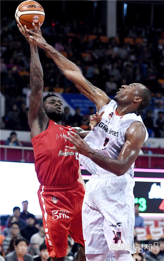 [아시아경제 김현민 기자]프로농구 서울 SK와 부산 kt의 2016-2017 정규리그 경기가 13일 서울 잠실학생체육관에서 열렸다. SK 화이트가 상대 심스의 슛블록에 막히고 있다.