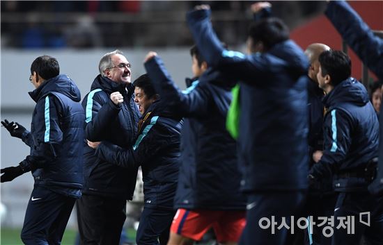 [아시아경제 김현민 기자]울리 슈틸리케 감독이 이끄는 축구대표팀과 우즈베키스탄의 2016 러시아 월드컵 아시아지역 최종예선 A조 5차전이 15일 서울월드컵경기장에서 열렸다. 슈틸리케 감독이 2-1 역전승을 확정한 뒤 스텝들과 기뻐하고 있다.