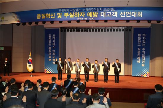 [아시아경제 주상돈 기자] 한국토지주택공사(LH)는 17일 서울 논현동 건설회관에서 'LH 주거단지와 도시기반시설의 품질혁신, 부실하자 예방을 위한 대고객 선언대회'를 진행했다. 선언대회에 참석한 박상우 LH 사장(왼쪽 네번째)과 참석한 건설업 전 분야의 관계자들이 선서를 하고 있다.