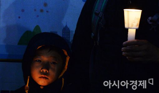 [아시아경제 문호남 인턴기자] 한 어린이가 19일 서울 종로구 내자동 로터리에서 박근혜 대통령의 퇴진을 촉구하며 촛불을 밝히고 있다.