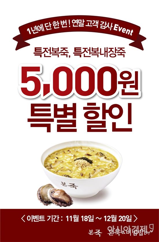 [아시아경제 오주연 기자] 본아이에프에서 운영하는 죽 전문점 본죽이 다가오는 연말을 맞아 보양죽 메뉴인 '특전복죽'과 '특전복내장죽'을 5000원 할인 판매하는 고객 감사 이벤트를 진행한다.