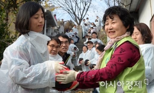 [아시아경제 문호남 인턴기자] 한국영상자료원 임직원들이 21일 서울 서대문구 홍은1동에서 사랑의 연탄 및 등유 전달식을 열고 이웃 주민에게 연탄을 전달하고 있다.