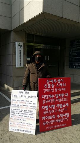 정보통신진흥협회(KAIT) 건물 앞에서 신분증 스캐너 도입에 반발해 전국이동통신유통협회(KMDA) 관계자가 1인 시위를 하고 있다.(사진제공=KMDA)