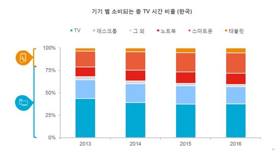 이에 따르면 한국에서 2013년과 2016년 사이 모바일 기기를 통한 주간 TV·비디오 시청 비율은 28% 증가했다. 같은 기간 그 외 기기에서의 시청 비율은 12% 하락했다.